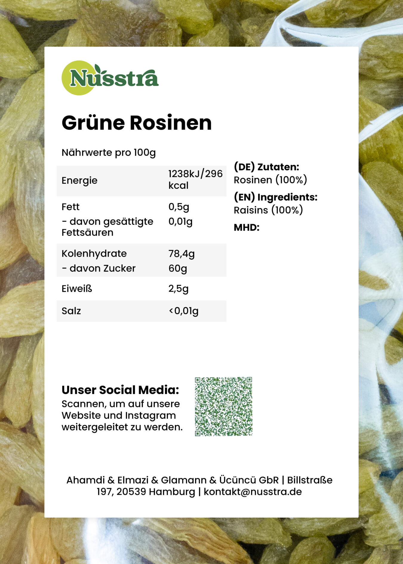 Unsere grünen Rosinen entstehen aus sonnengereiften, hellen Trauben. Schonend getrocknet, bleiben sie angenehm weich, saftig und schmecken mild-honigsüß mit einer frischen, fruchtigen Note – pur als Snack oder vielseitig in der Küche.