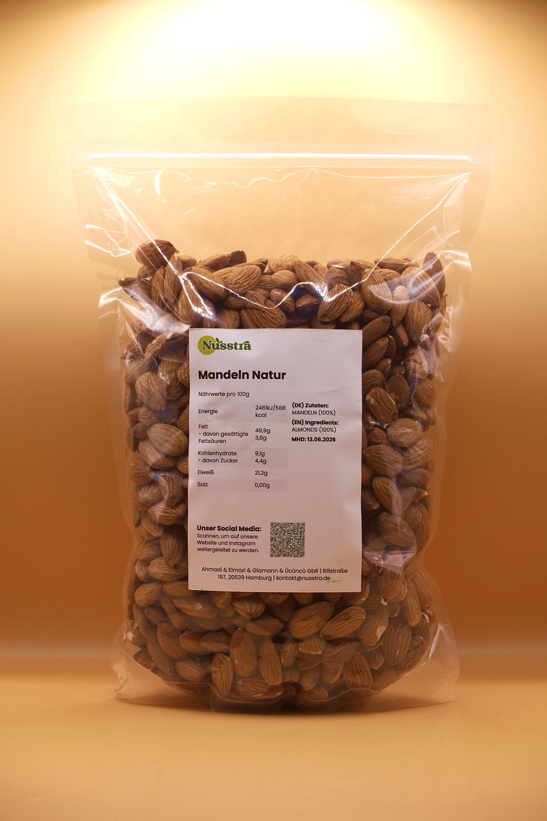 Unsere Mandeln Natur kommen zu 100 % pur – ohne Salz und ohne Zusätze. Sie überzeugen mit ihrem mild-nussigen Aroma, angenehmem Biss und vielseitigen Einsatzmöglichkeiten in süßen wie herzhaften Rezepten.