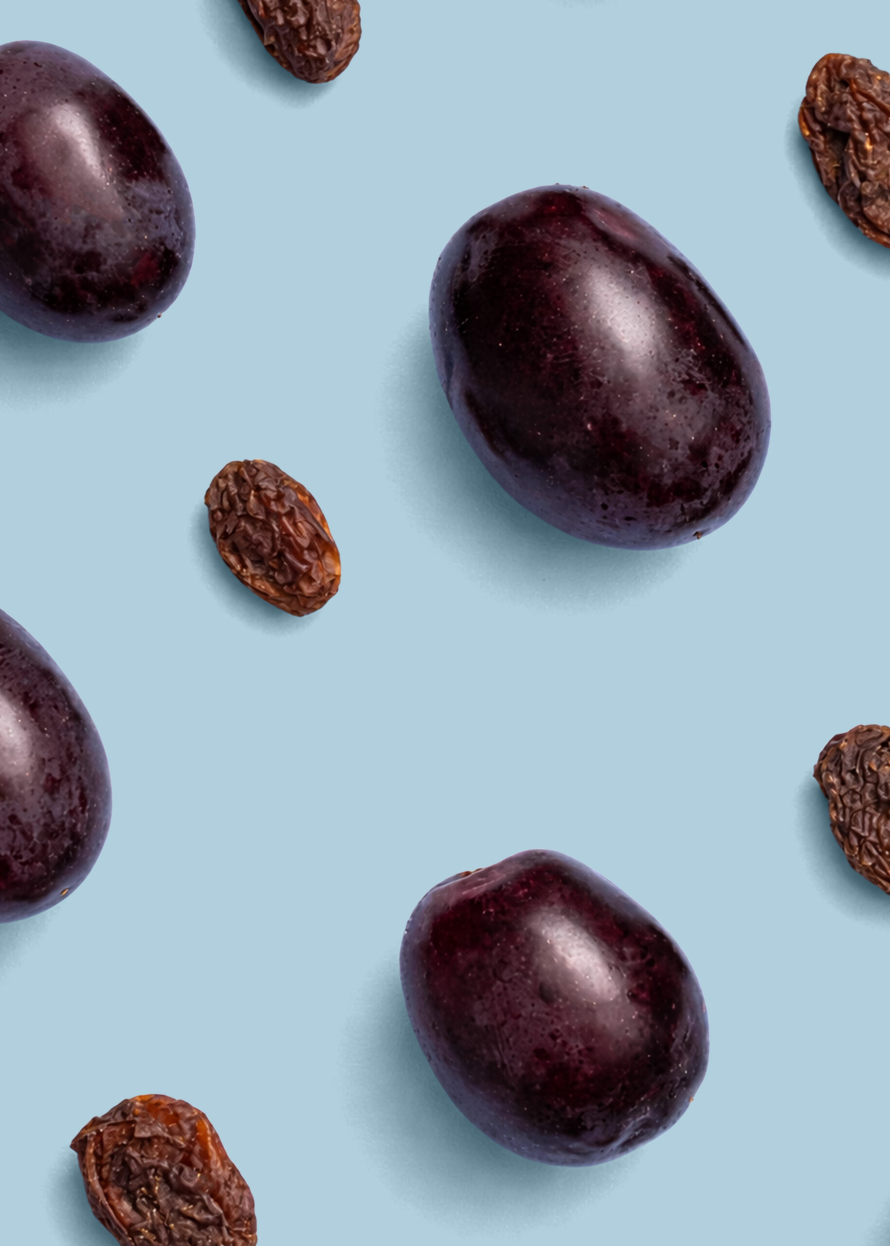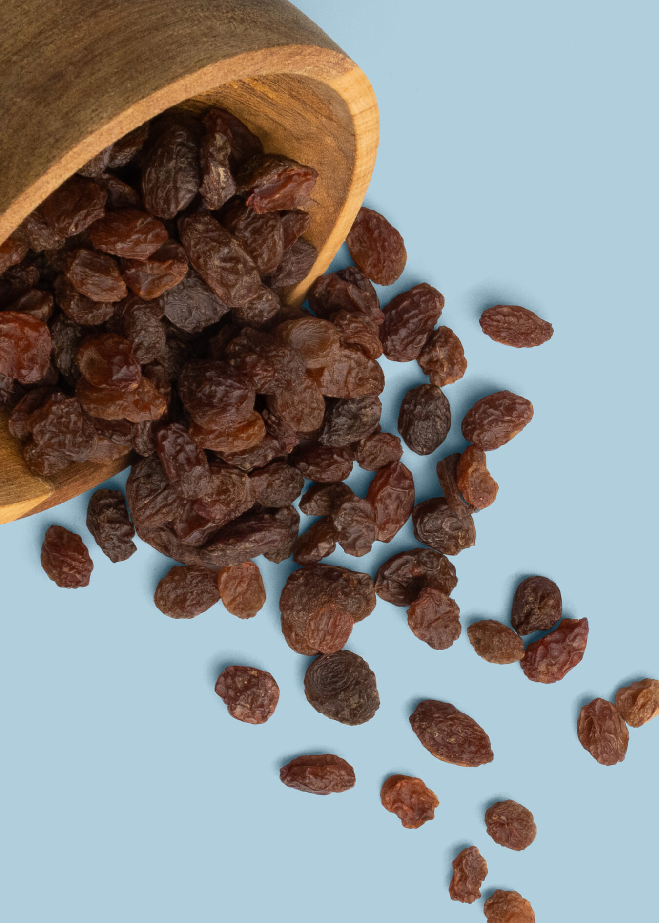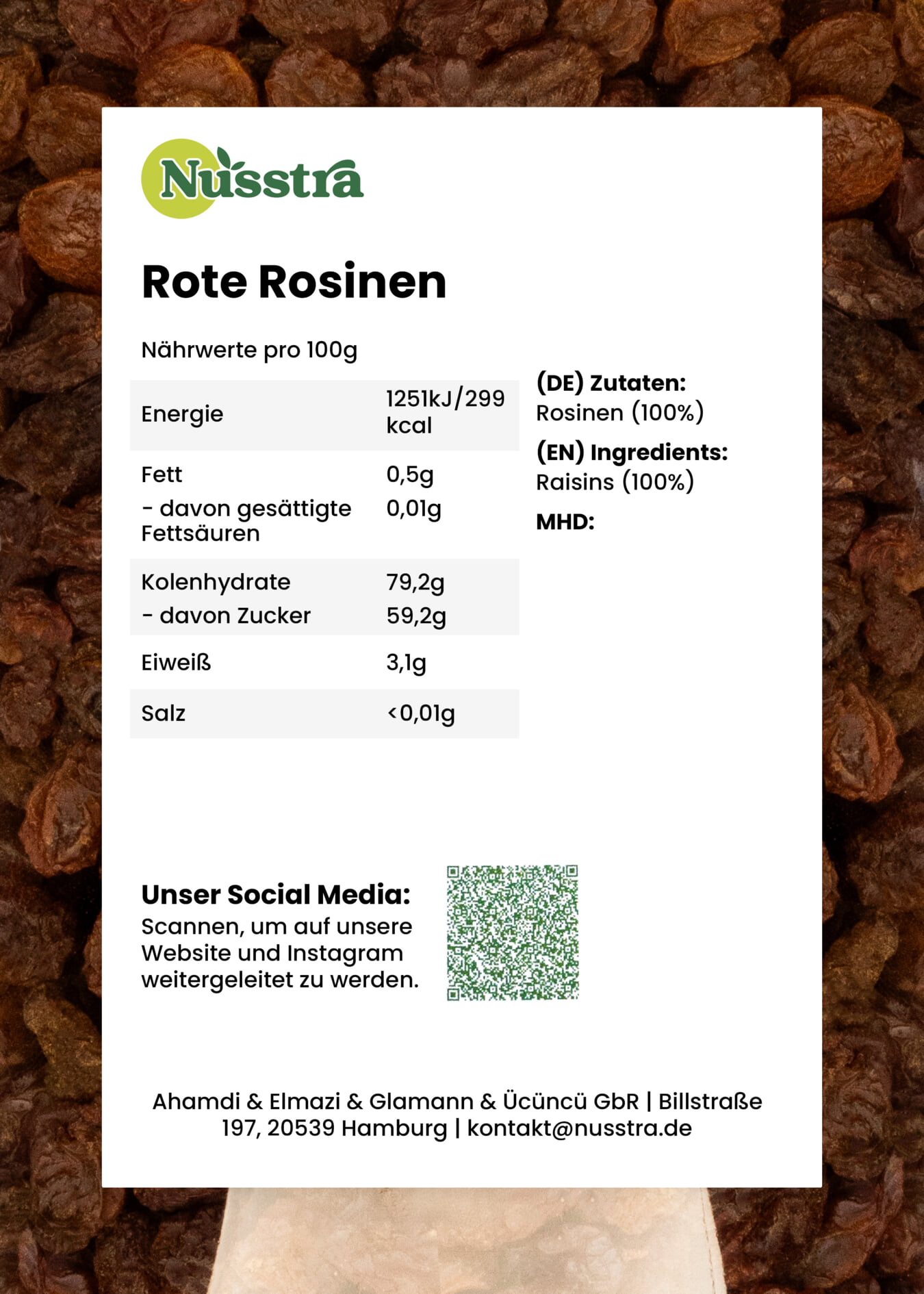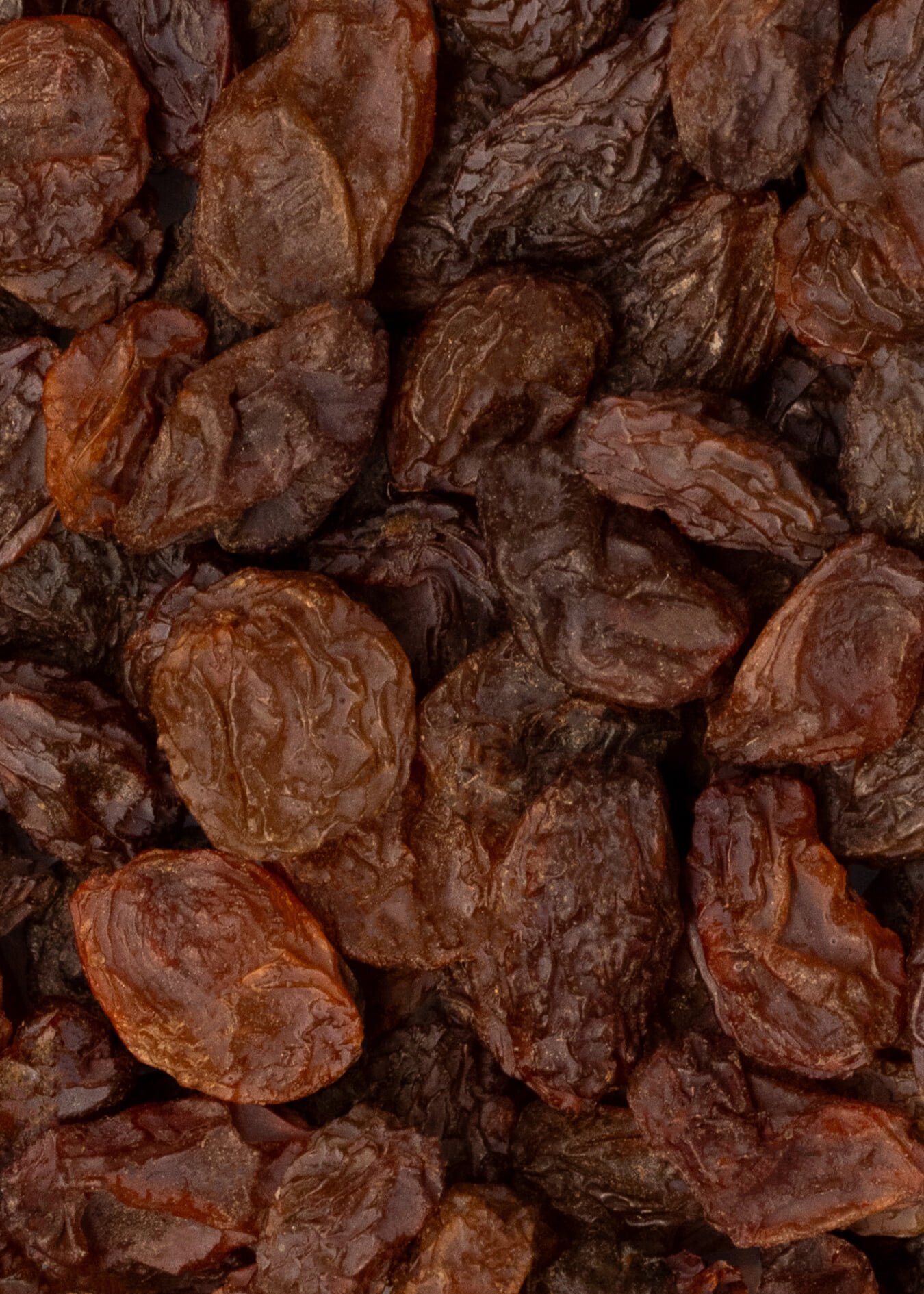Unsere roten Rosinen werden aus reifen, dunklen Trauben schonend getrocknet. Dadurch konzentriert sich ihr vollmundig fruchtig-karamelliger Geschmack; die Beeren bleiben angenehm weich und saftig – ideal als Snack oder zum Verfeinern süßer und herzhafter Gerichte.